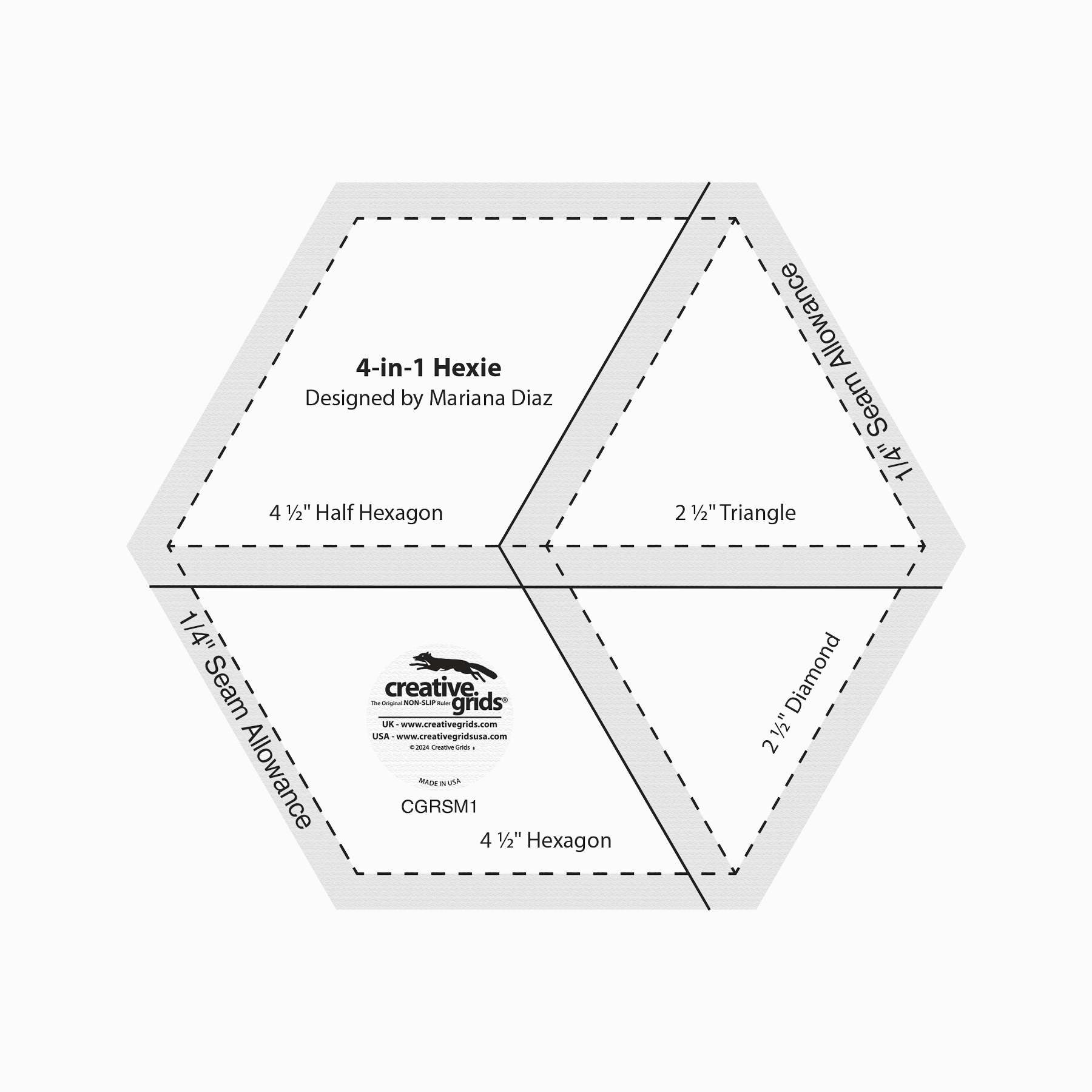 This 4-1/2in Hexie cuts four different shapes, all from strips, and all easy to follow. Shapes include a 4-1/2in hexagon, a 4-1/2in half hexagon, a 2-1/2in triangle, and a 2-1/2in diamond shape.