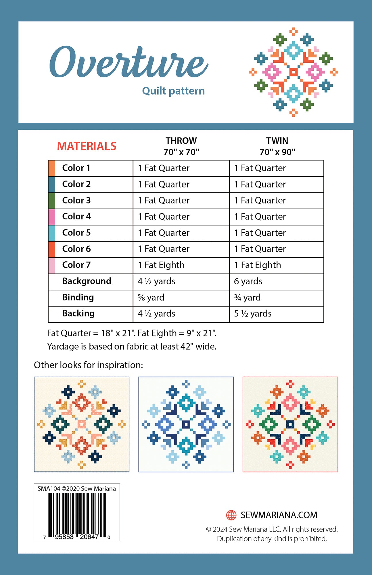 - The Overture Pattern comes with 18 full color pages with cutting diagrams, and step by step instructions and graphics to make it easy to follow along.