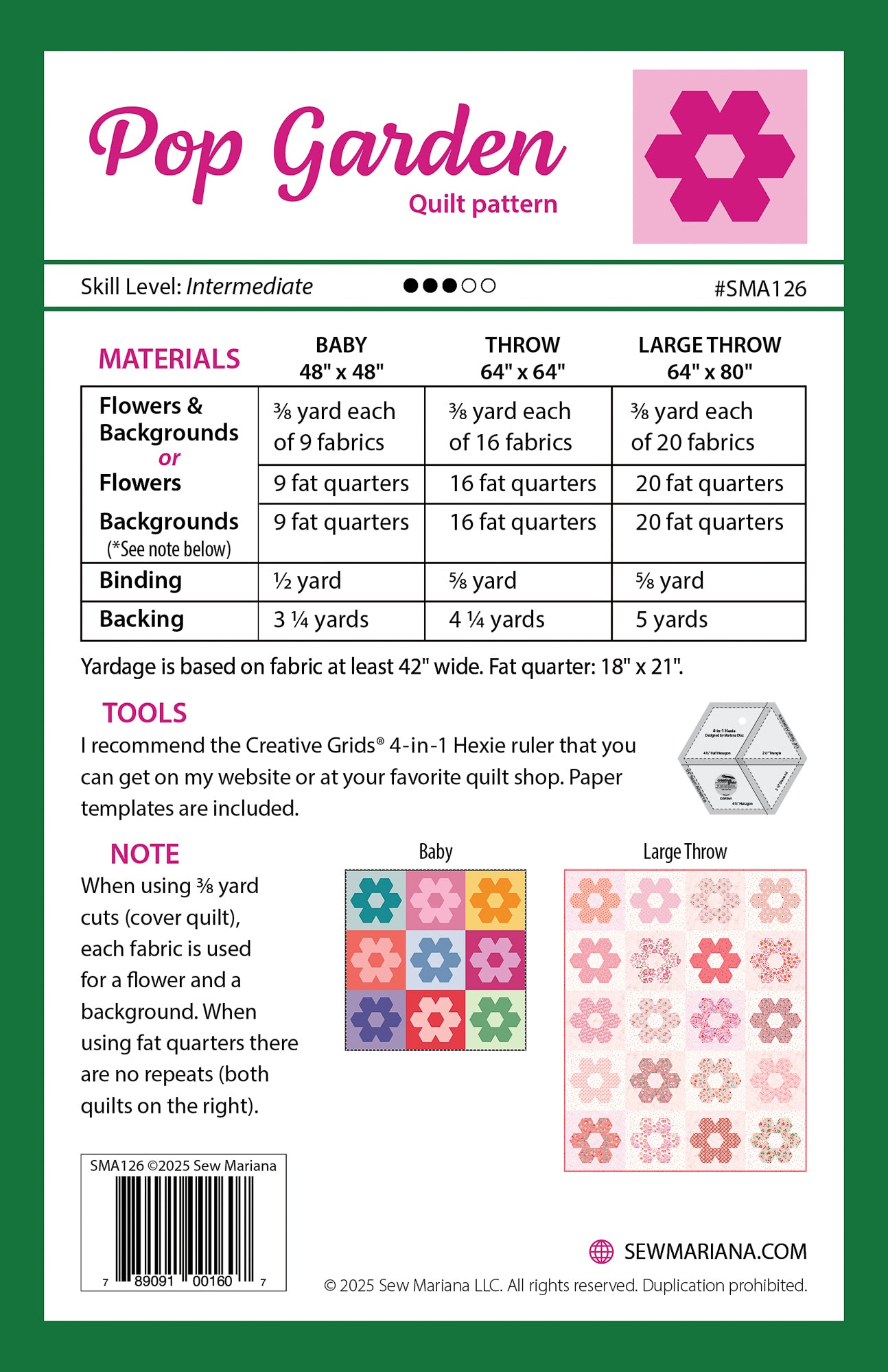 - Quilt sizes: Baby or Wall, Throw and Large Throw.